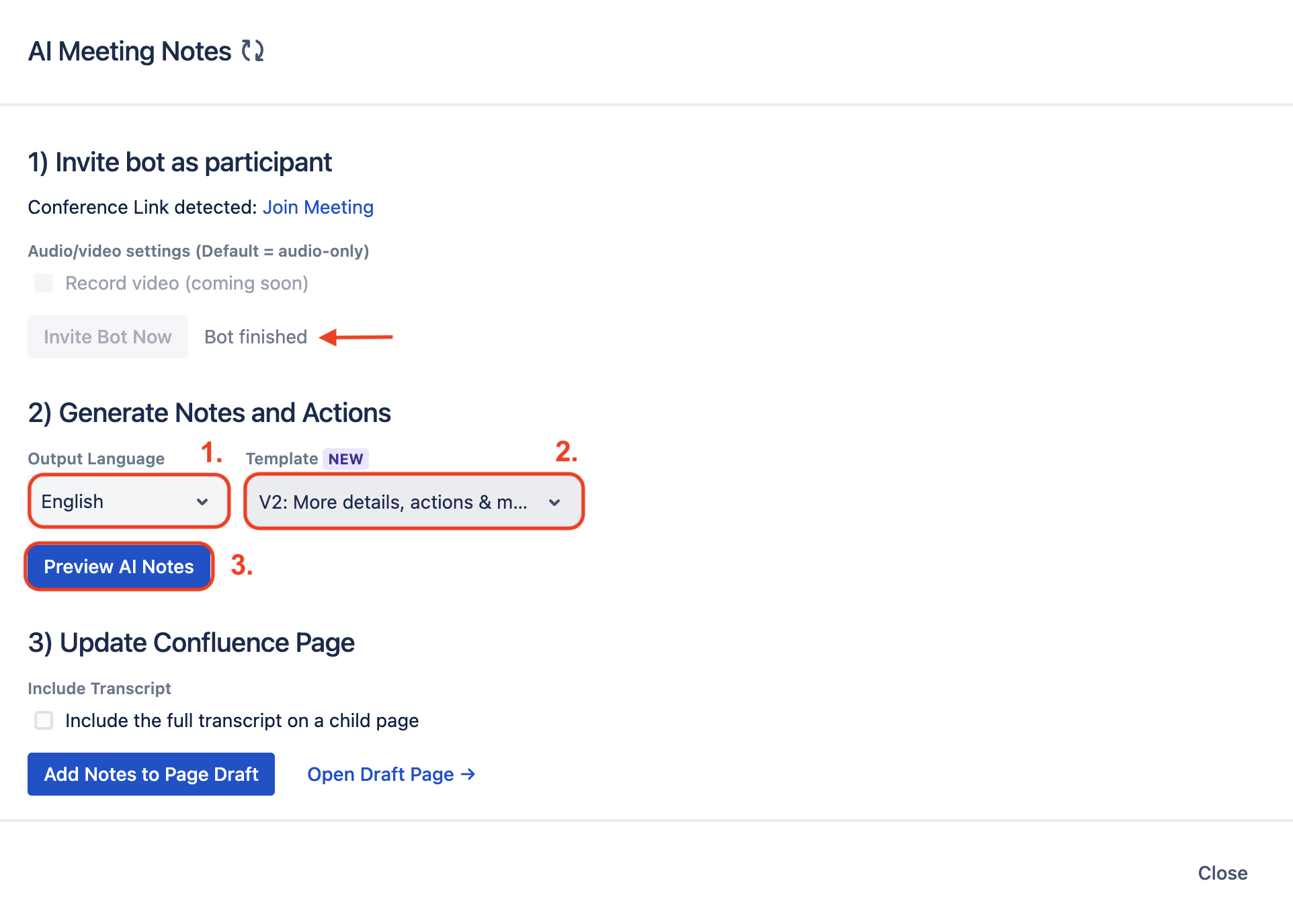 If the preview looks good, click Add Notes to Page Draft (1) to add the notes to the connected Confluence page.