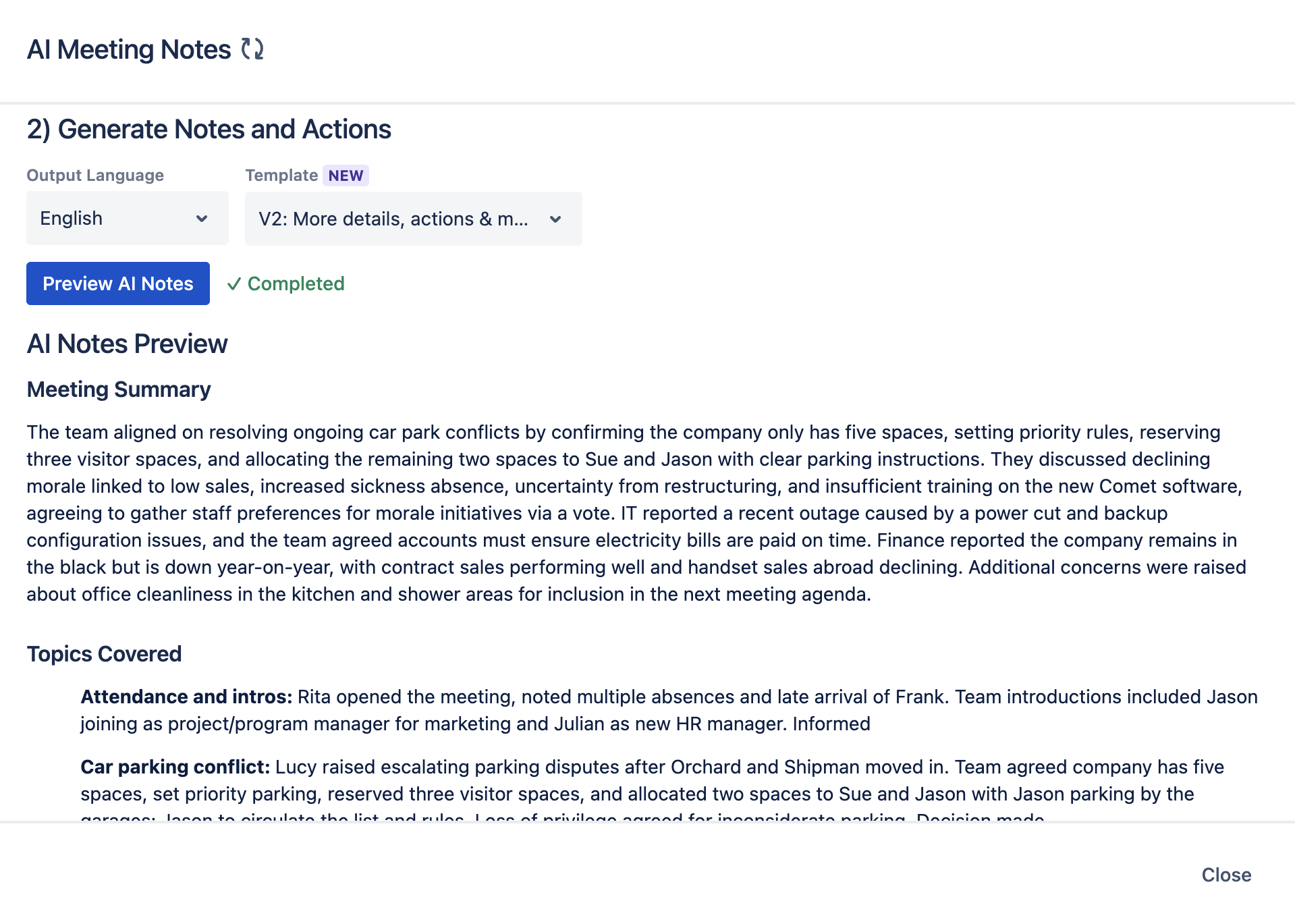 After the preview has been generated, you can still change the language or template and regenerate the notes if needed.