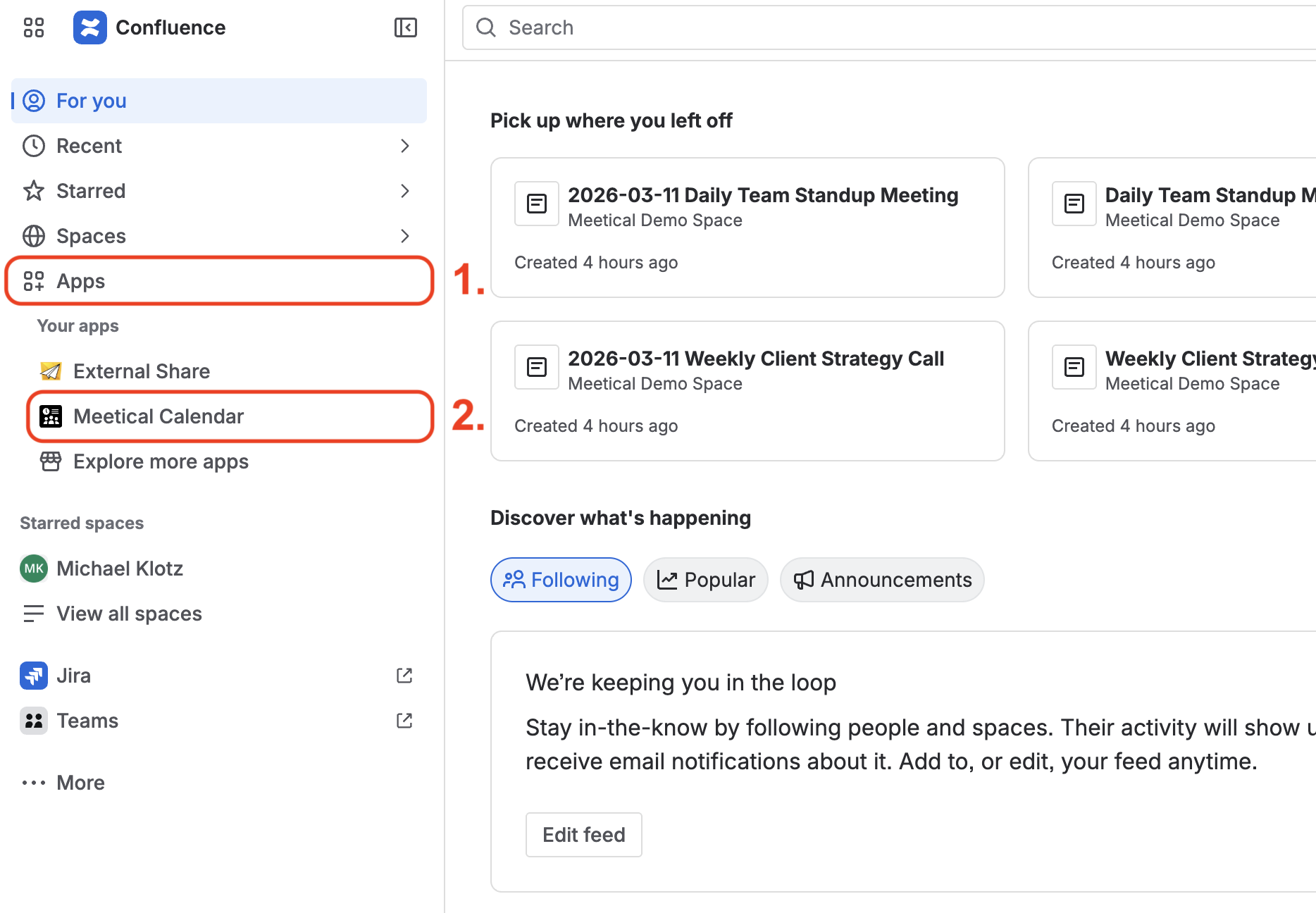 To start using Meetical AI, open the Meetical Calendar app in Confluence.